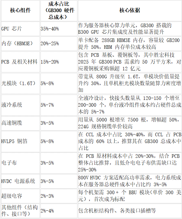 GB300高价逻辑:采用PTFE覆铜板(单机柜材料成本57万-76万元)、HVLP5铜箔(占PCB成本30%-40%)及全液冷方案(快接头数量翻倍),推升BOM成本。